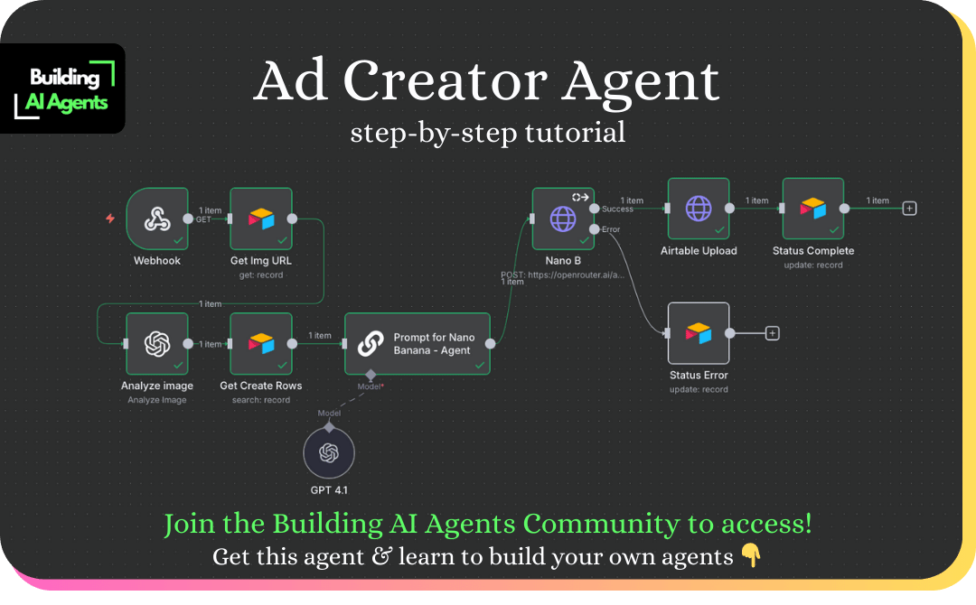 This guide walks you through building an ad creator agent that turns any single image (product shot, poster, or ad) into dozens of marketing variations with one click. Using n8n, Airtable, and Nano Banana, you’ll create an assistant that creates and manages ad creatives at scale, all from inside Airtable.